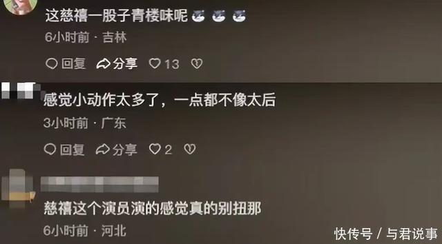 这时一个风尘味十足的太后登场,将前面所有演员精心布置的氛围给破坏,就好像一颗老鼠屎坏了全锅粥让人难受。 也难怪有网友在网上大肆吐槽,说林夏薇饰演的慈禧太后一出场: